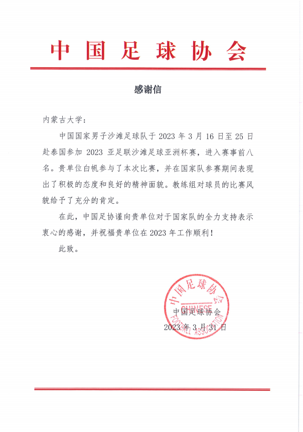 我院教师白帆入选中国国家男子沙滩足球队,参加了2023年3月在泰国芭提雅举行的沙滩足球亚洲杯,最终小组出线,取得八强的成绩,是我校教师首次代表国家队参加国际比赛。白帆取得多粒关键进球,表现突出,赛后收到了中国足协的感谢信。