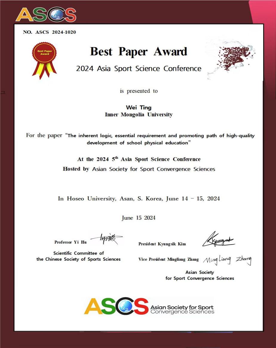 太阳集团20072007so太阳集团副教授魏婷博士团队的“The Inherent Logic, Essential Requirement And Promoting Path Of High-Quality Development Of School Physical Education——Based On The Perspective Of Digital Artificial Intelligence”成果,获第五届亚洲体育科学大会((2024 Asia Sport Science Conference))2024年度最佳优秀论文奖((Best Paper Award))。