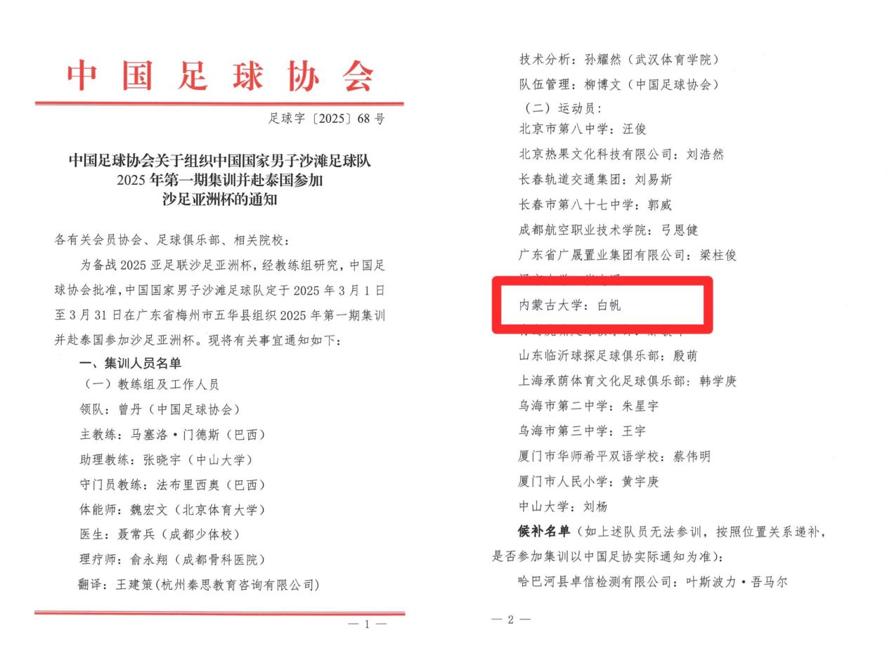 中国国家男子沙滩足球队于2025年3月1日至31日在广东省组织2025年第一期集训并准备赴泰国参加亚洲杯,共有16名球员入选,我校体育教师白帆继2023年沙滩足球世界杯预选赛后再次入选国家队大名单,这是他第16次入选沙滩足球国家队大名单。