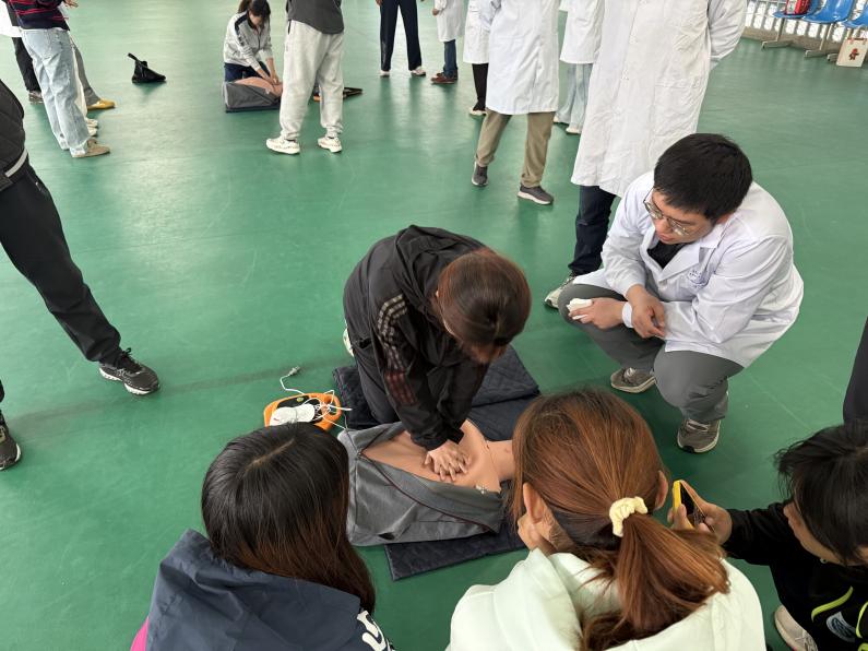 活动当天,校医院的资深医护人员首先为学生们进行了心肺复苏术(CPA+AED)急救知识和海姆利克急救法的理论教学。随后,为了让同学们更加牢固的掌握要点,强化培训效果,医护人员设置了实操练习环节,同学们分组利用人体模型练习胸外按压、人工呼吸、AED的使用方法以及海姆利克急救法的操作,医护人员逐一纠正动作细节,确保同学们技能掌握规范。