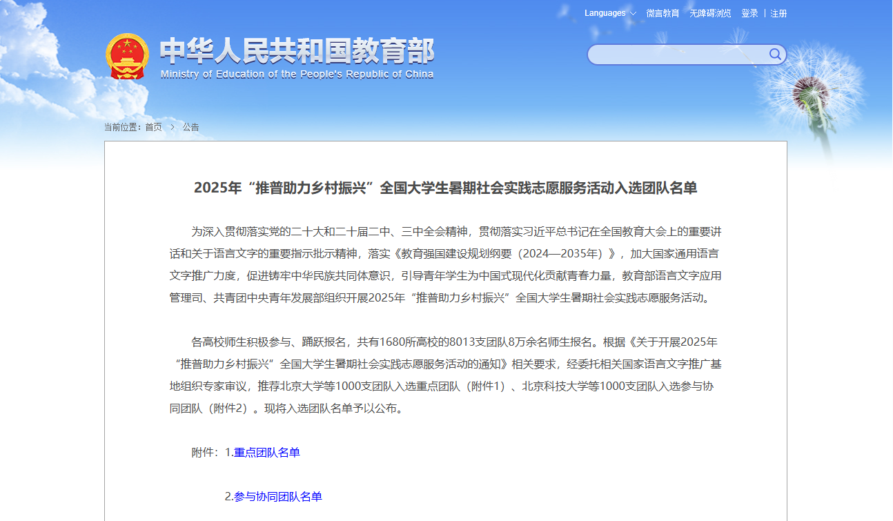 7月3日,教育部语言文字应用管理司、共青团中央青年发展部联合公布2025年“推普助力乡村振兴”全国大学生暑期社会实践志愿服务活动入选名单,我院由郝鑫星同学带队、呼日查老师指导的“普润乡土 体育健民”实践团从全国8013支队伍中脱颖而出,成功入选国家级参与协同团队(全国共1000支),成为内蒙古自治区聚焦“体育+推普+赋能”三轨服务的专项团队。