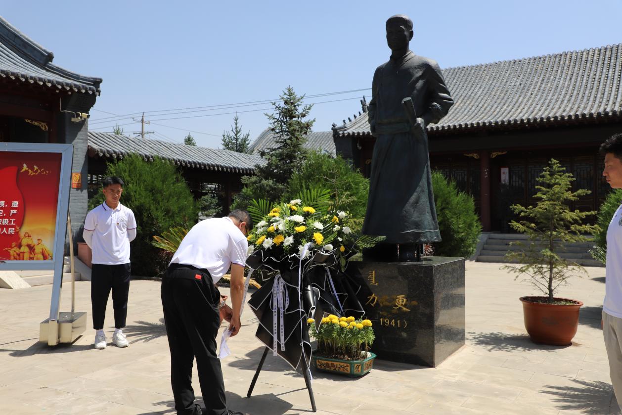 在贾力更烈士故居的展厅内,各位老师和同学参观了贾力更烈士的生平事迹展览,了解了他在革命时期的奋斗历程和牺牲精神。通过照片、家书等珍贵文物,在场人员都感受到了贾力更烈士对革命事业的坚定信念和对家乡、对祖国的深深热爱。温毅刚书记说:“贾力更烈士的英勇事迹和革命精神是值得我们学习和传承的宝贵财富,我们应该倍加珍惜和发扬光大。”随后,大家一同向贾力更烈士雕塑敬献了花篮,表达对英雄的崇敬和怀念之情。