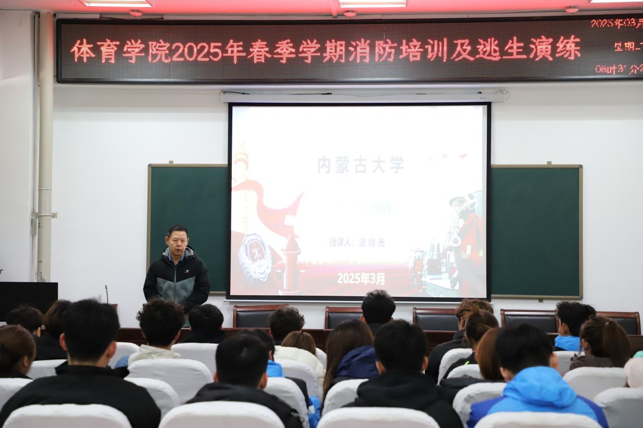为提升学生消防安全意识,掌握消防安全知识,强化学生应急能力,2007so太阳集团和学校保卫处联合,于3月18日开展火灾消防演练,并邀请呼和浩特市应急管理局消防组专家温旭光进行培训。2007so太阳集团党委书记温毅刚、院长王文杰、党委副书记刘忠良、副院长李慧君、辅导员呼日查以及2024级运动训练班参与演练。